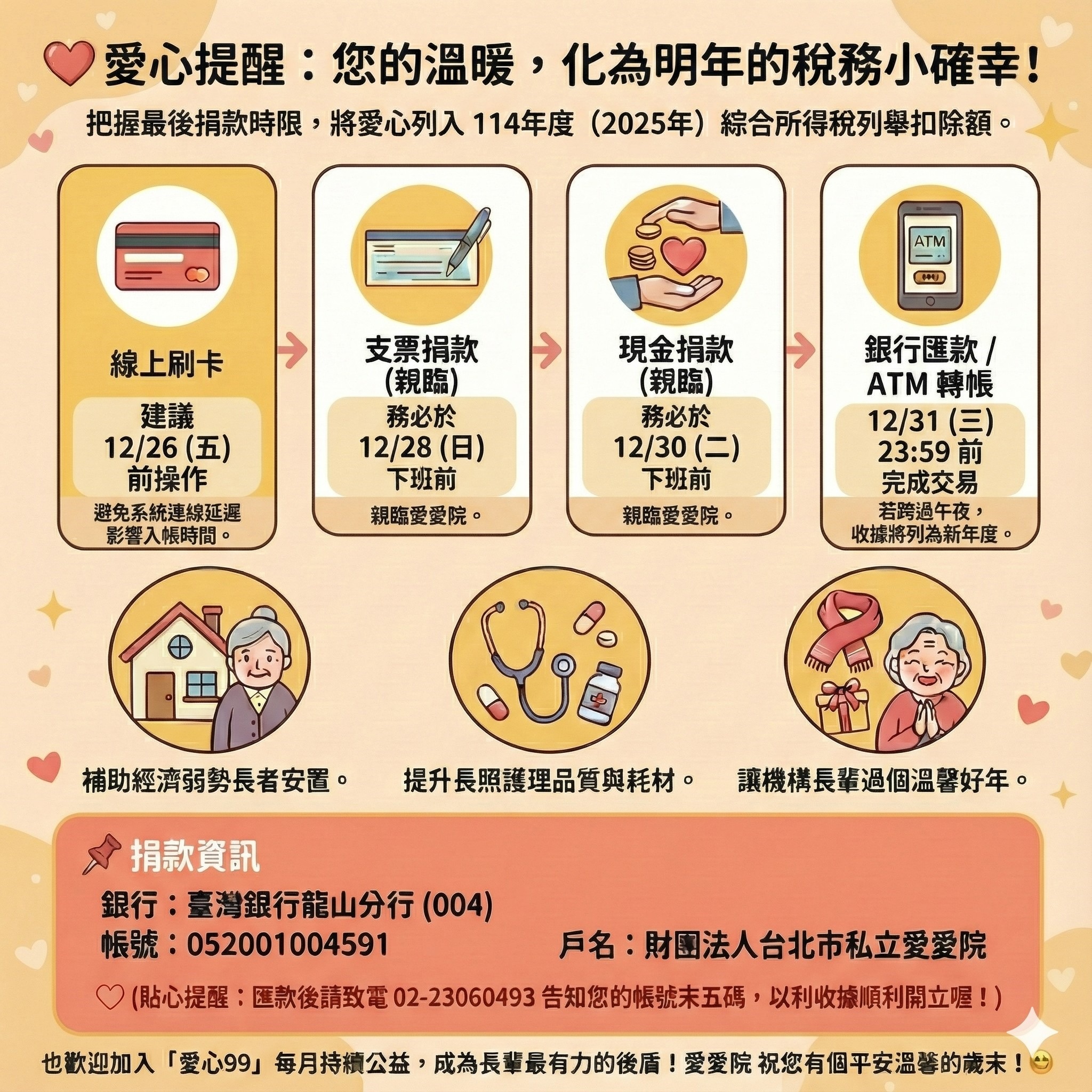 感謝您一直以來對「愛愛院」長輩們的溫暖支持。在這個歲末時刻,我們想特別提醒您,如果您希望將今年的愛心捐款,列入 114 年度(2025年)綜合所得稅的「列舉扣除額」,請務必留意以下的**「最後捐款時限」**喔!
