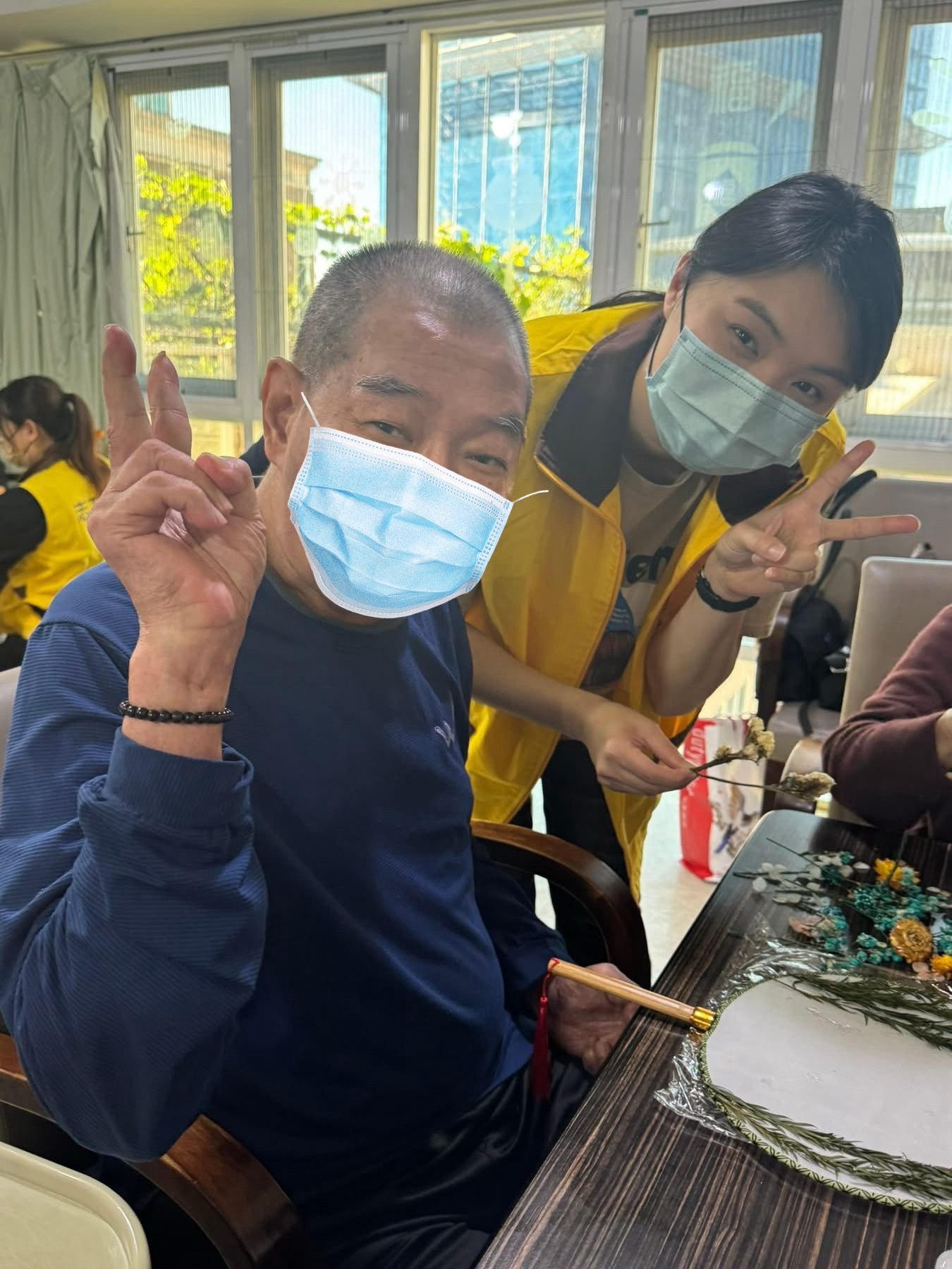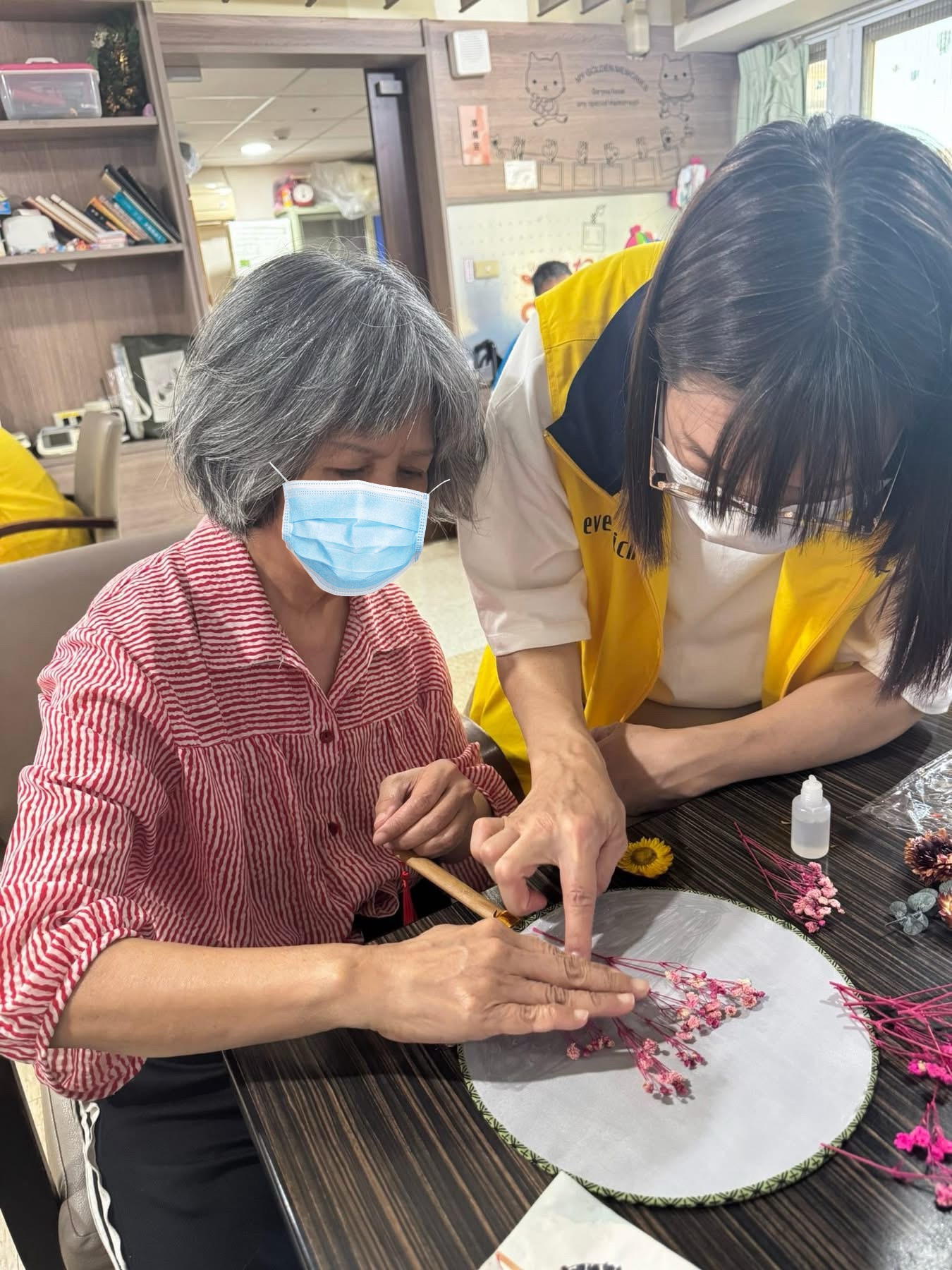 長輩們邊動手擺放花材,邊與志工們談笑互動,不僅完成了一把把獨一無二的扇子,更留下滿滿溫暖的笑容。