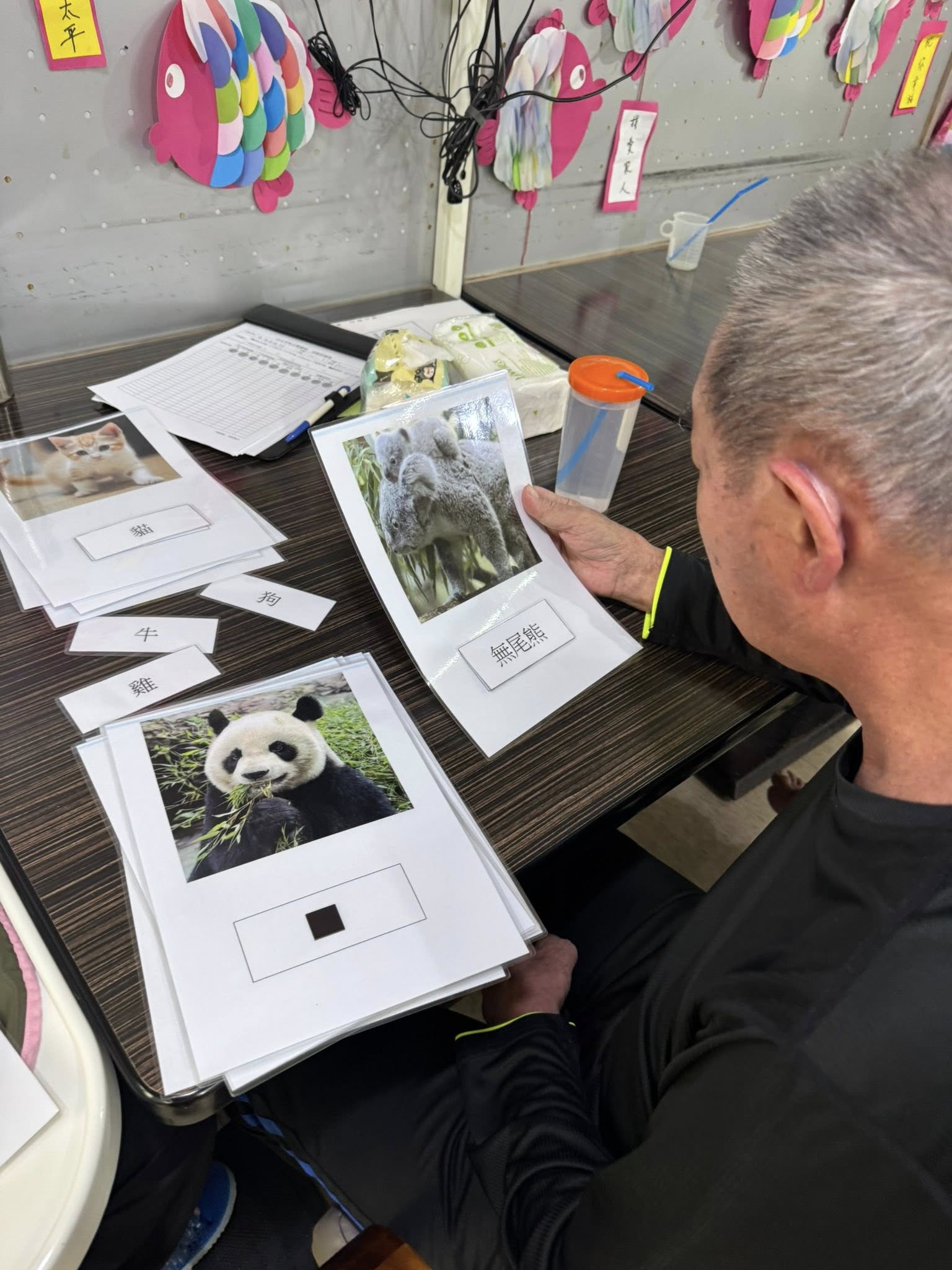 今天的活動「動物來相認」,桌上擺滿了一張張可愛的動物圖片與文字卡。長輩輪流圍坐在一起,專注地看著每一張圖片,試著說出動物的名字。