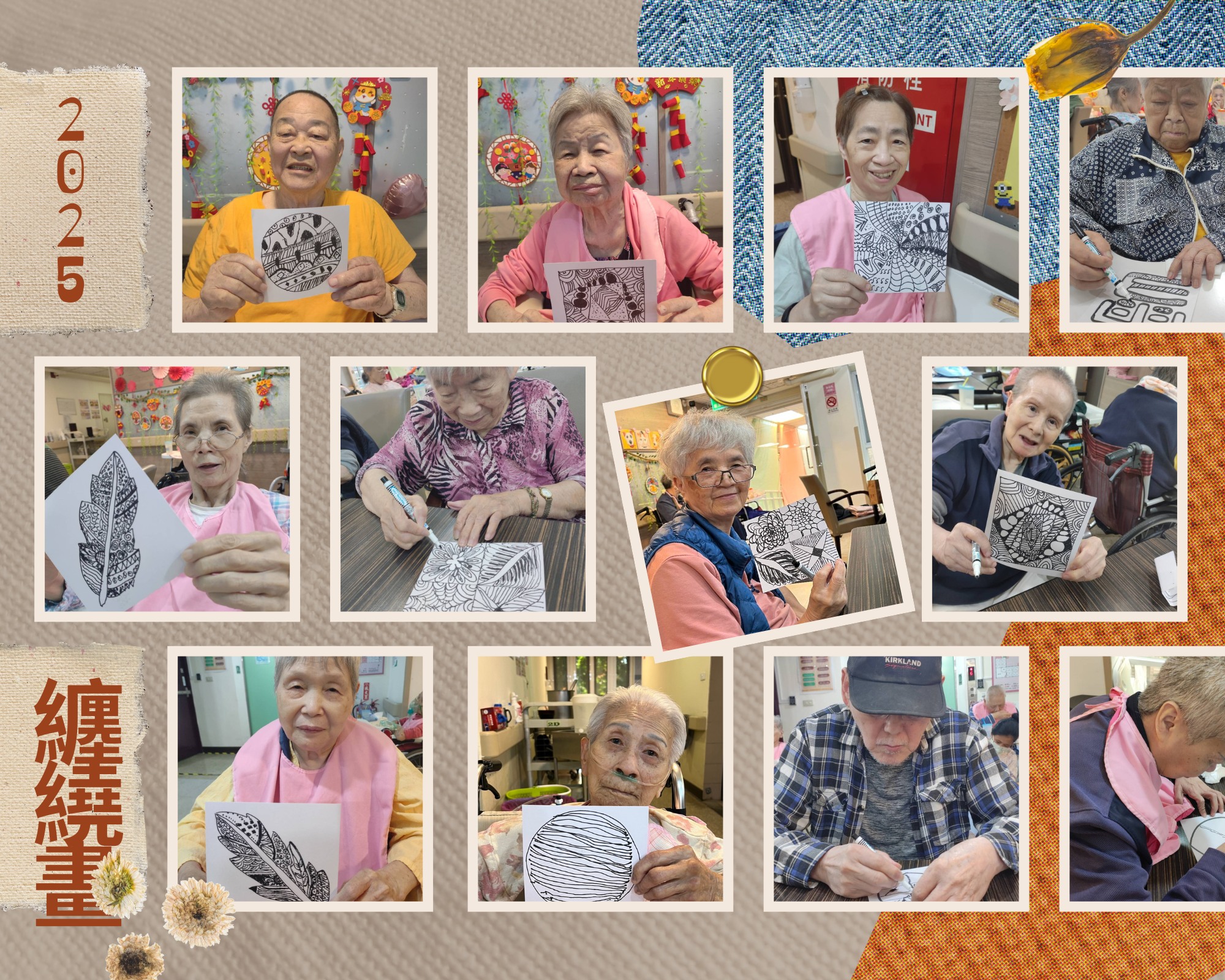 在長照機構中,許多長輩面臨身體退化、生活單調及社交機會減少的挑戰。為了提升長輩的生活品質與心理健康,愛愛院社工組設計以「纏繞畫」為媒介,透過簡單重複的圖樣創作,引導長輩進入放鬆、專注與創造的心流狀態。纏繞畫不需要美術基礎,人人都可以參與,在創作中獲得成就感與自我肯定,同時也提供一個溫暖的團體互動空間。透過此活動,為長輩的生活注入藝術的靈光與心靈的撫慰。