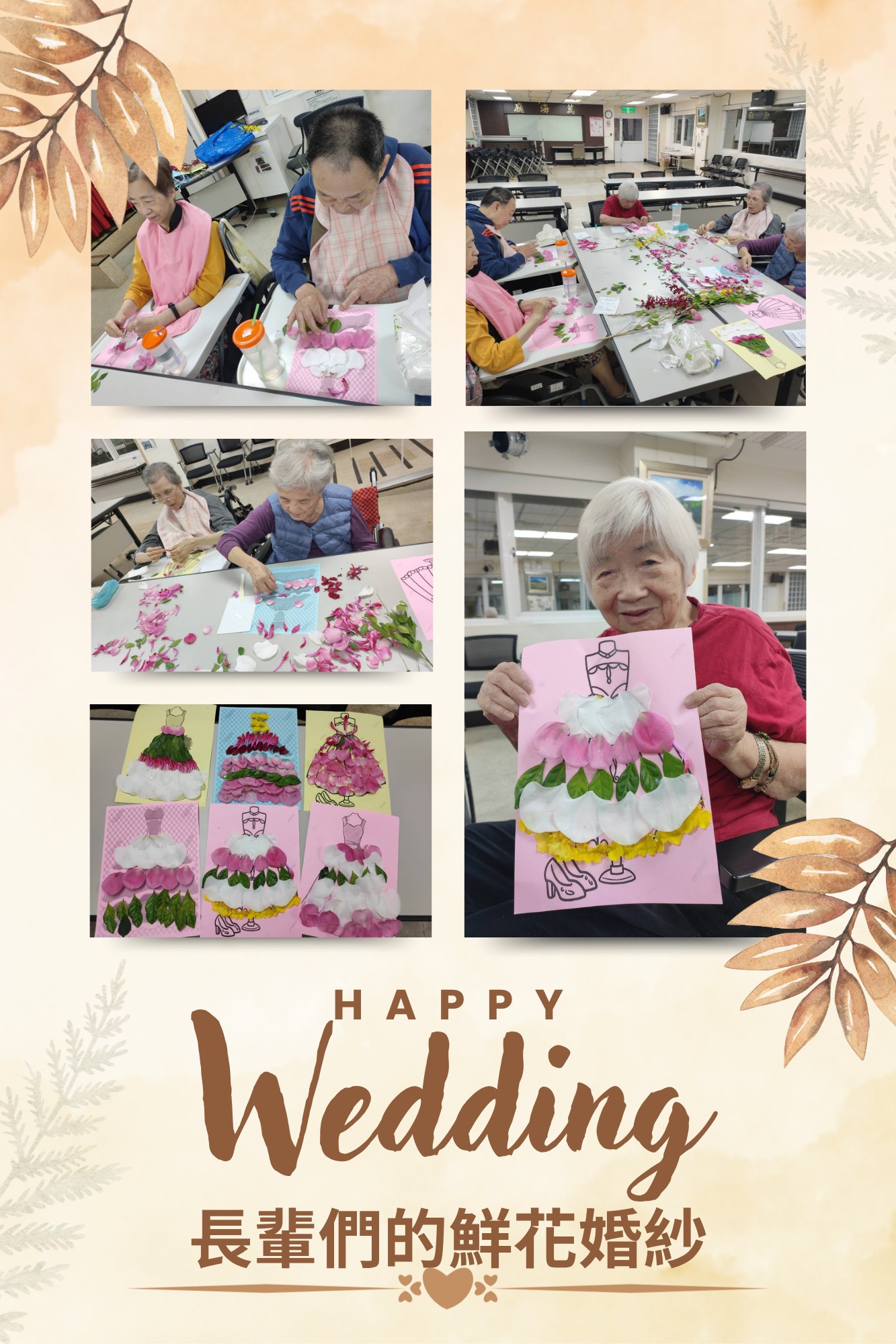 社工們立刻把這份美好延續下去,帶著長輩們一起動手,將花材設計成一件件「鮮花婚紗禮服」。