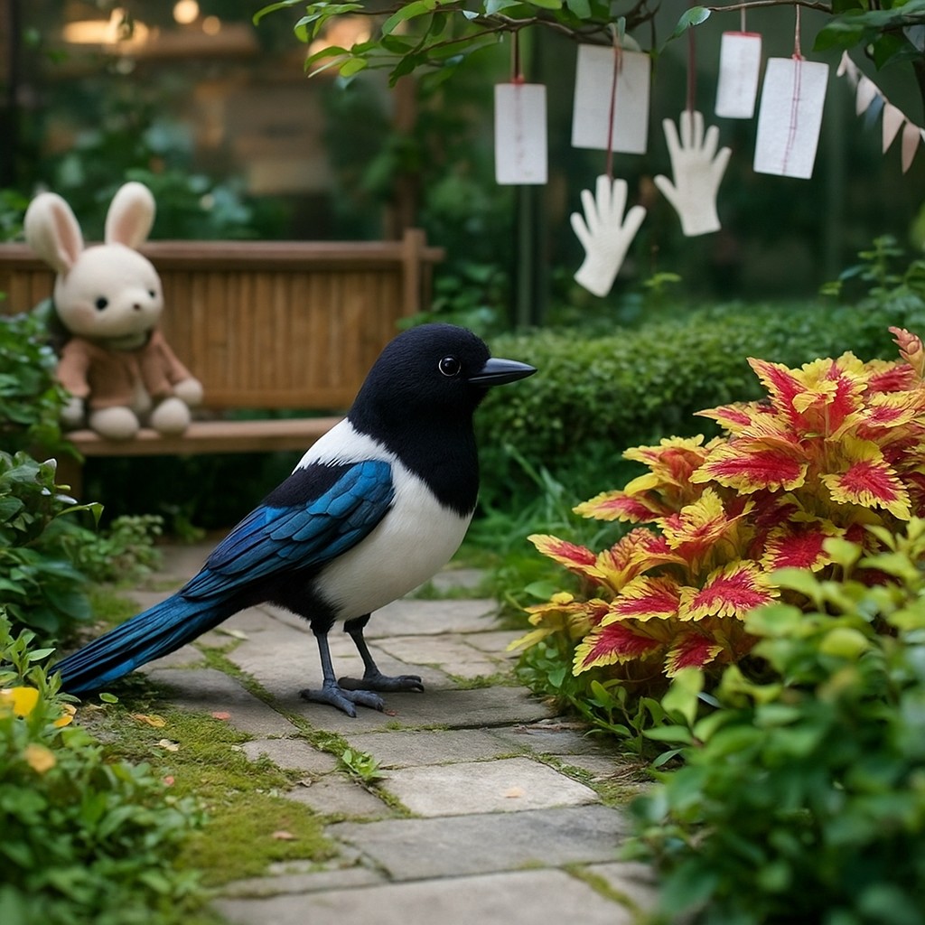 牠安靜地在草地、樹枝間停留,黑白分明的羽毛在陽光下閃著藍綠色光澤,彷彿帶來了一份溫柔的驚喜。