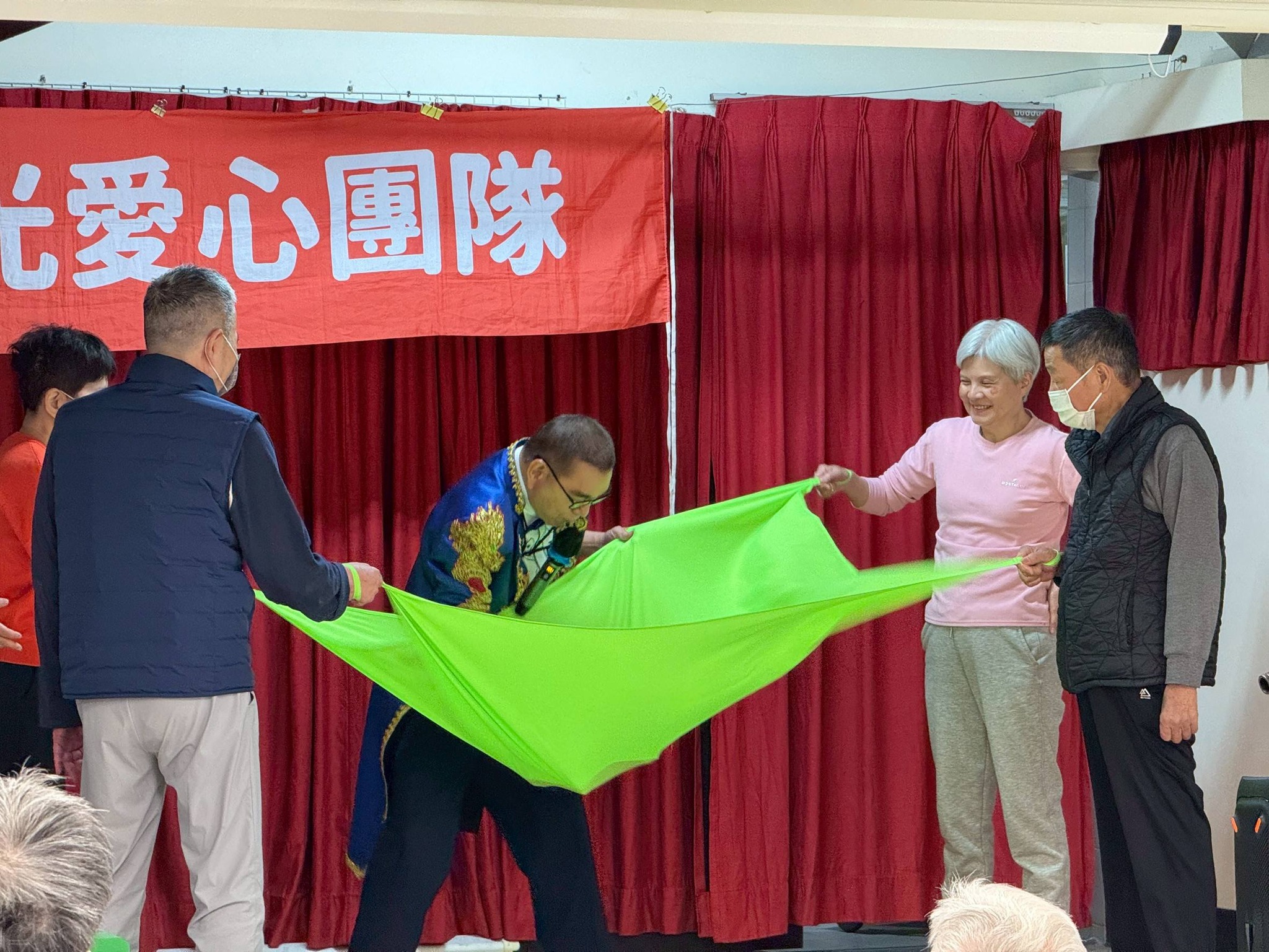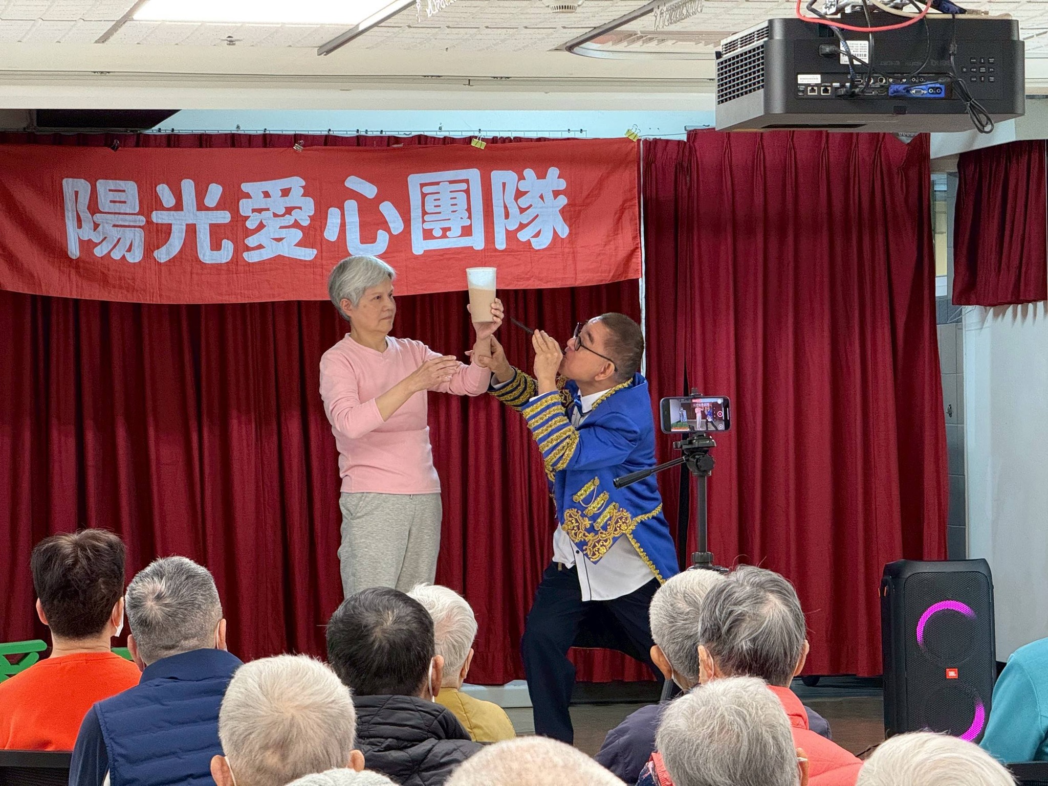 重頭戲是 魔術互動——魔術師邀請長輩上台協助表演,先是隔空用吸管喝飲料,又是手拿畚箕(米篩)一鏟,米粒變成爆米花,長輩們驚呼聲此起彼落,甚至還搶著一起品嚐!看到長輩眼裡閃著童心的光芒,現場笑聲與掌聲不斷,熱鬧非凡。