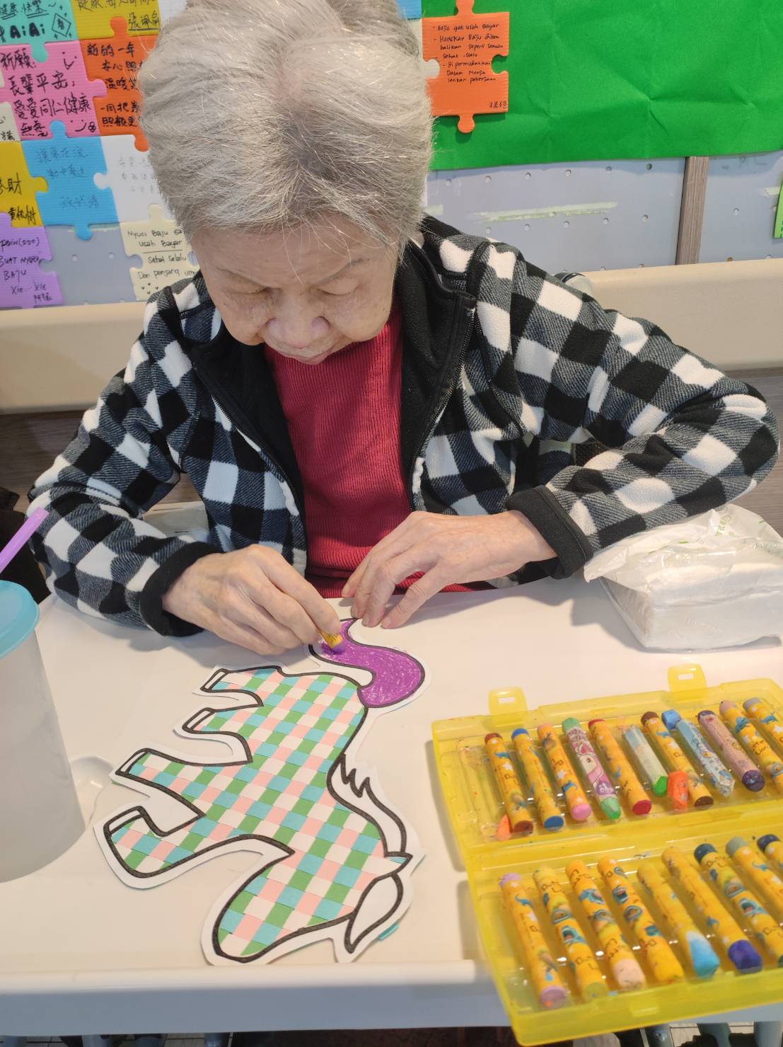 這是一場展現巧思的集體創作:指尖的編織力:長輩們運用巧手,將一條條紙帶交錯編織,賦予了馬兒堅韌的形態。 繽紛的色彩力:另一群長輩則化身色彩大師,為每一匹馬點綴上絢麗的色彩。