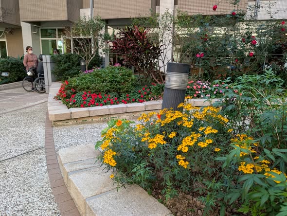 愛愛院戶外花園更是繽紛燦爛❤️,繡球花與黃花迎風、粉紅與紅色花朵層層綻放,彷彿替新的一年鋪上希望的花毯。長輩們在陽光下散步談笑,家屬相伴左右,畫面溫馨動人。這不只是佈置的美,更是彼此陪伴與關懷所交織出的幸福風景。